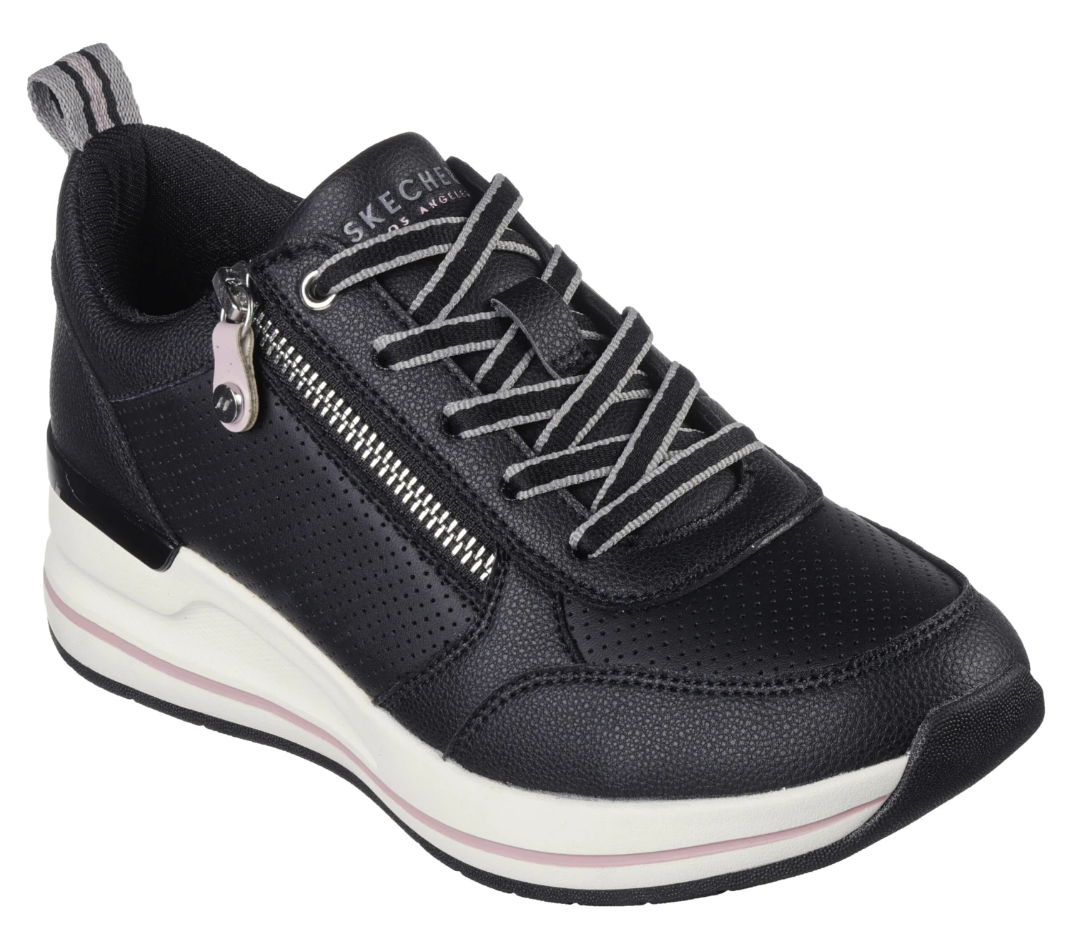 Zip into sporty style wearing Skechers Street Billion 2 – Side Lines. This fashion lace-up features a perforated duraleather upper with a lateral zipper, a wedge-fit midsole and a Skechers Air-Cooled Memory Foam® insole.