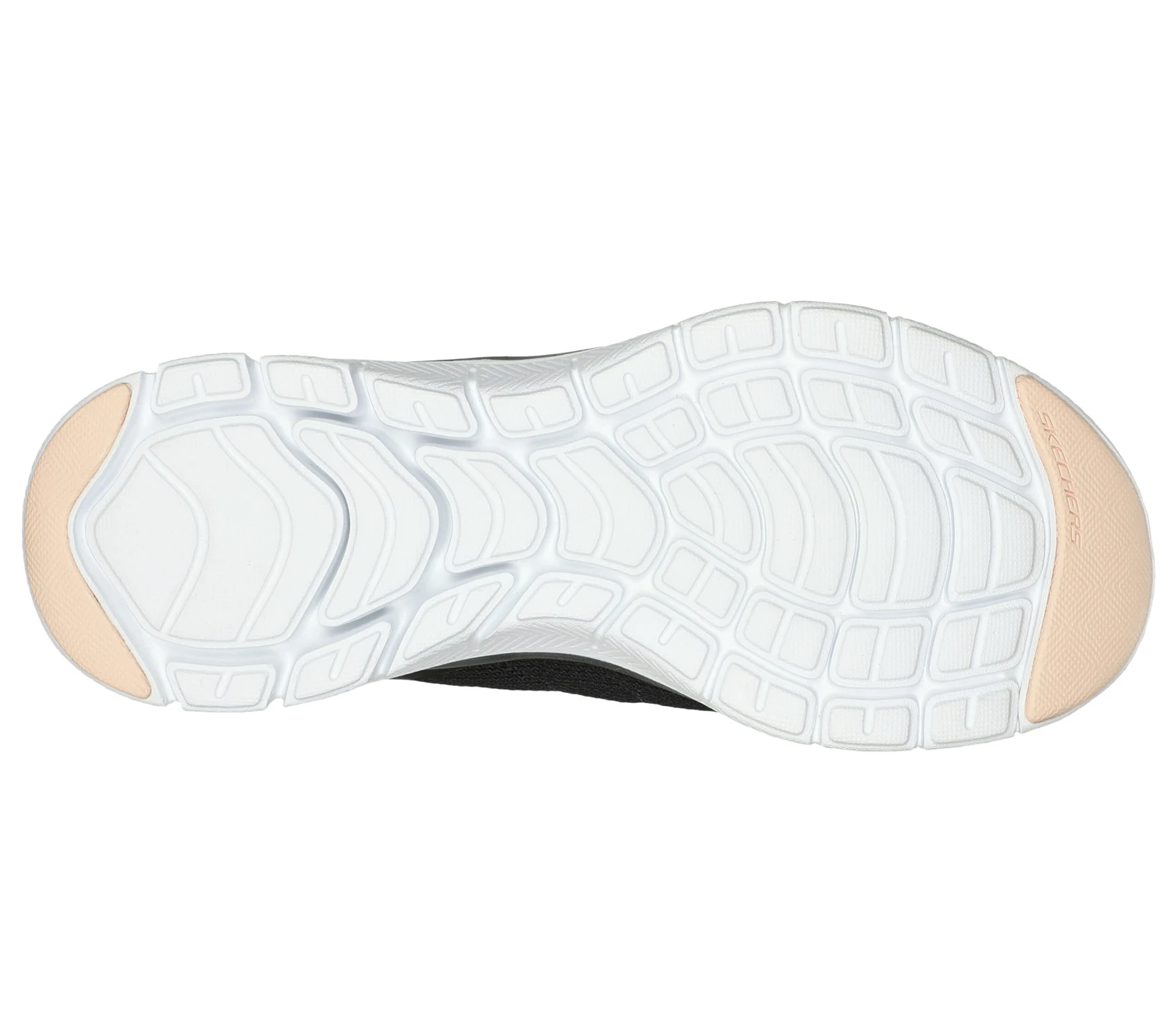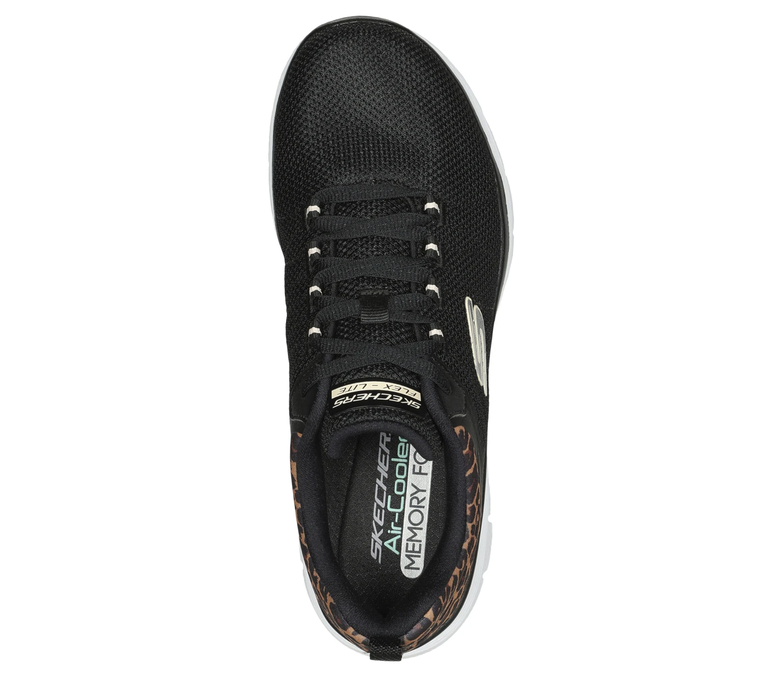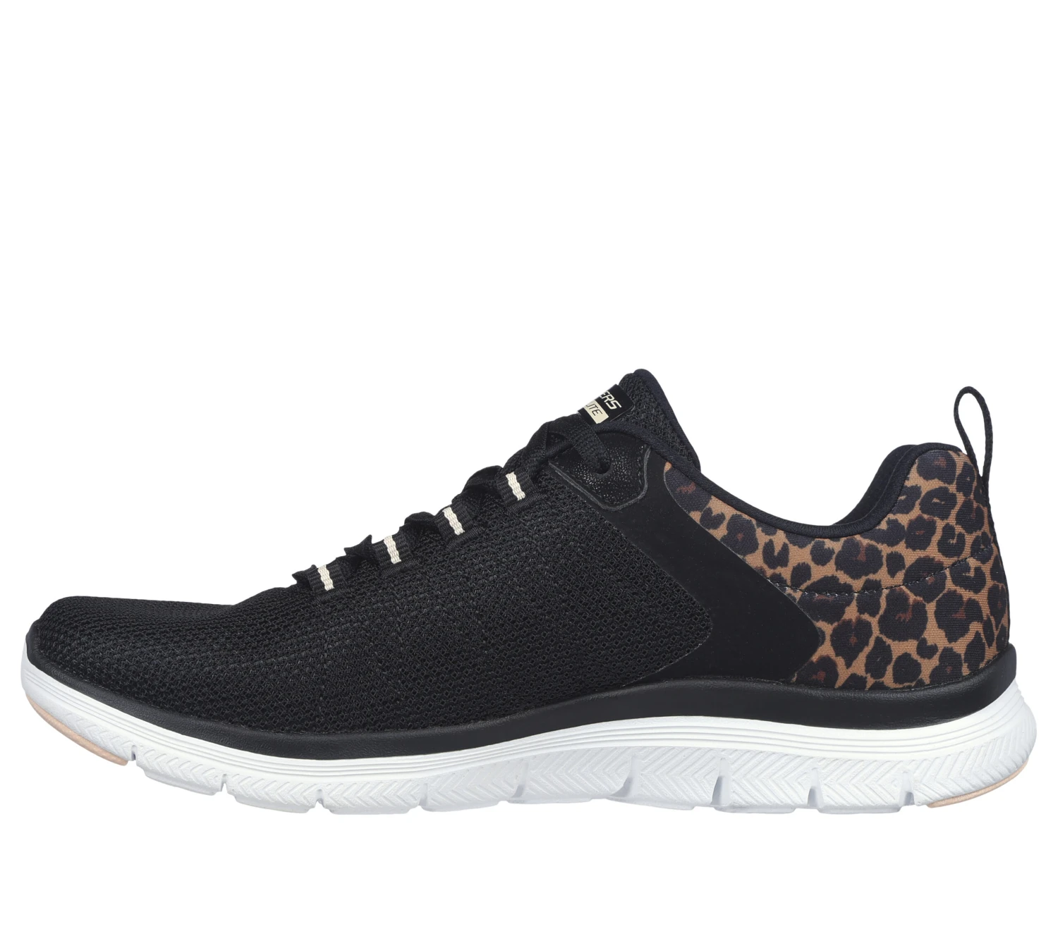 100% KNITTED COMFORT® Break out of the house and into purr-fect comfort with Skechers Flex Appeal® 4.0 – Wild Ballad. This sporty vegan lace-up features a mesh upper with leopard print heel trim and a cushioned Skechers Air-Cooled Memory Foam® insole.