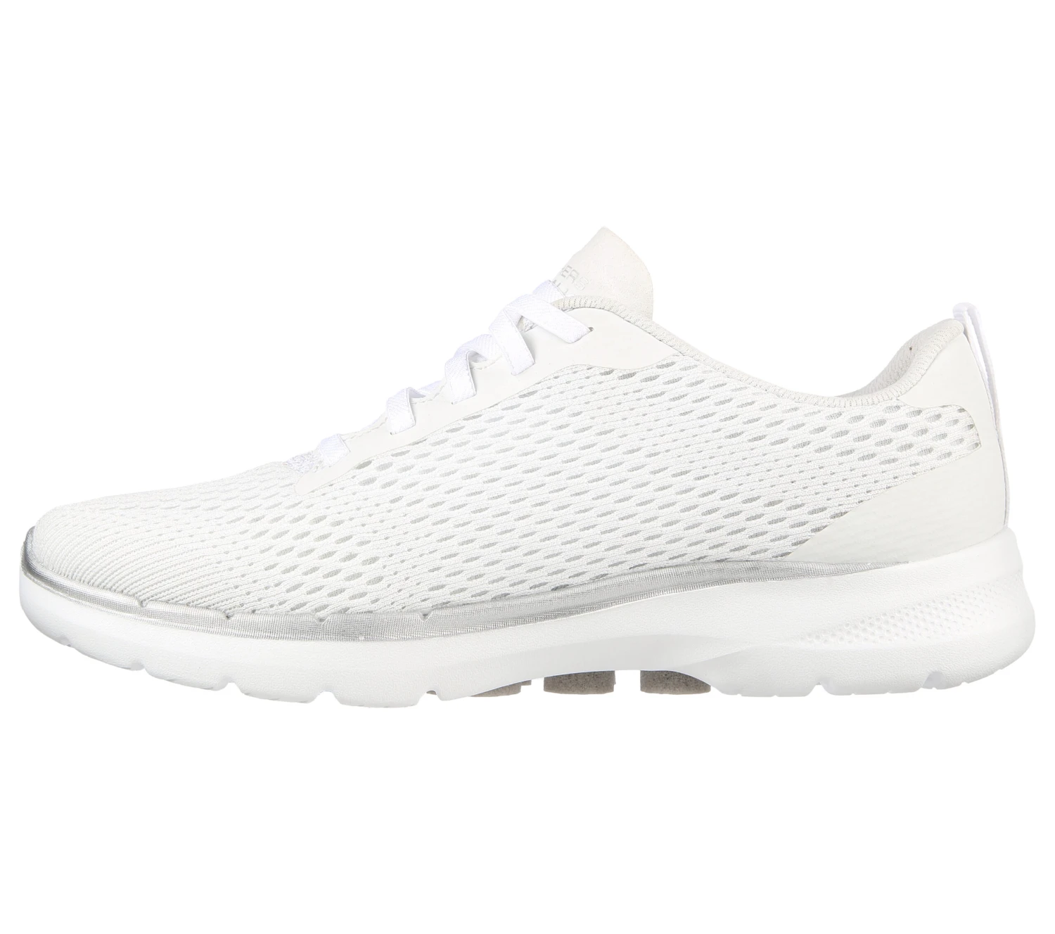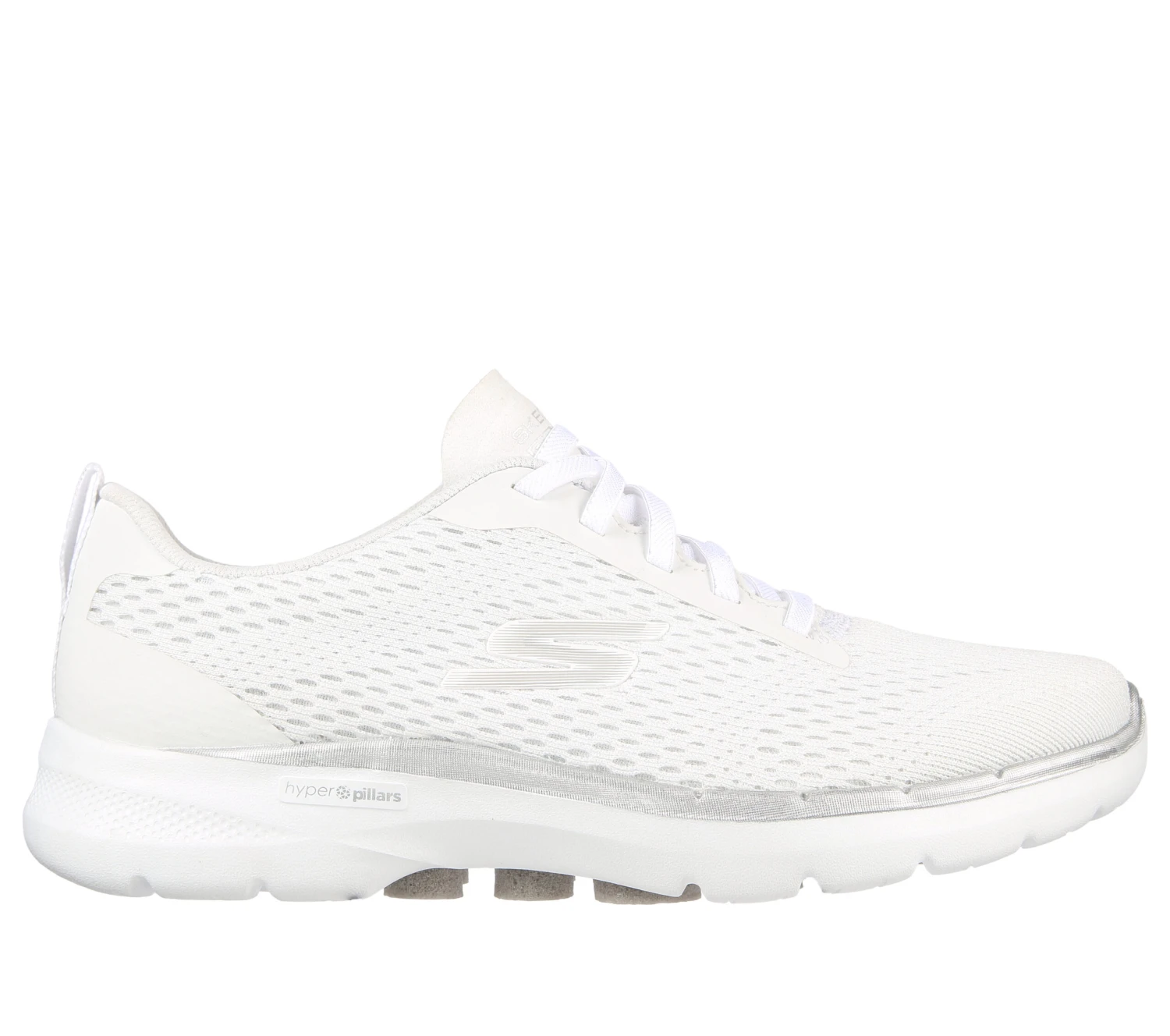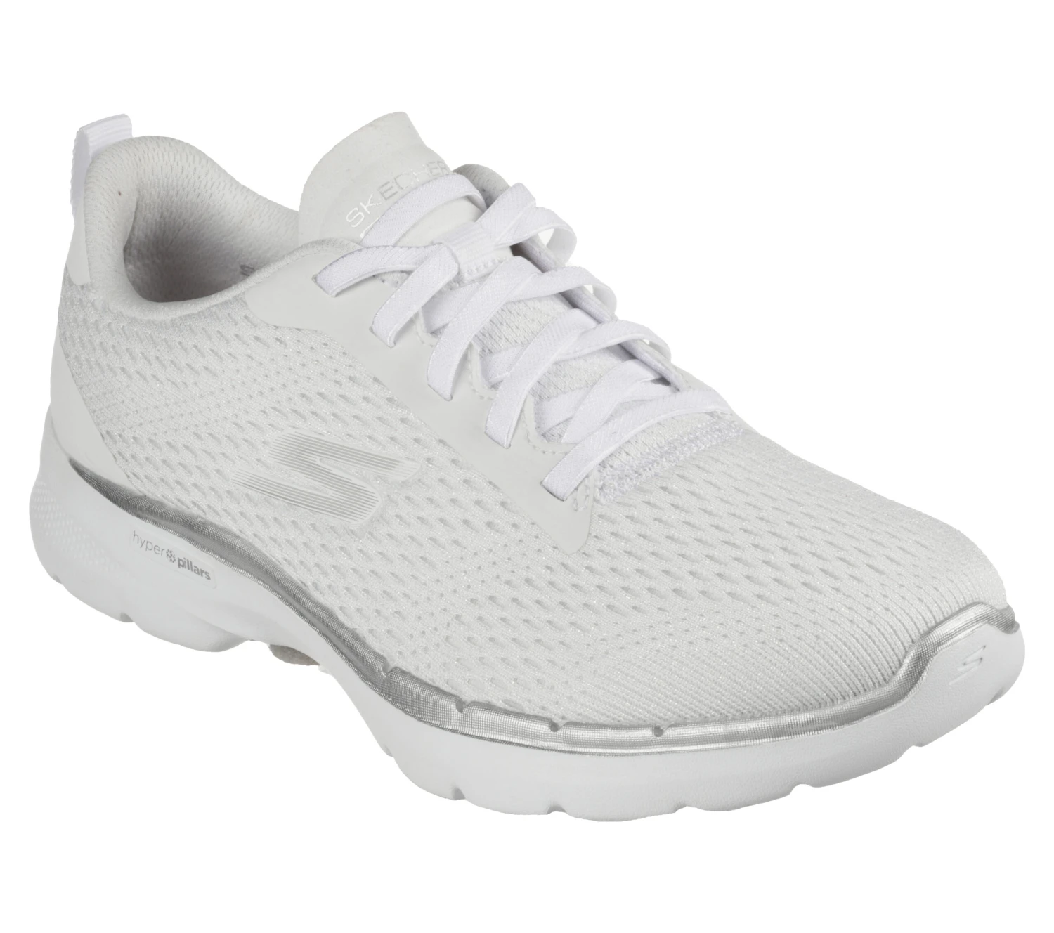 Stand out in shimmering dynamic comfort with the Skechers GO WALK 6 – Bold Vision shoe. This pull-on sneaker features an athletic sparkle mesh knit upper with a bungee-laced front, lightweight ULTRA GO cushioning midsole, Air-Cooled Goga Mat insole, and high-rebound Hyper Pillar Technology for added support.