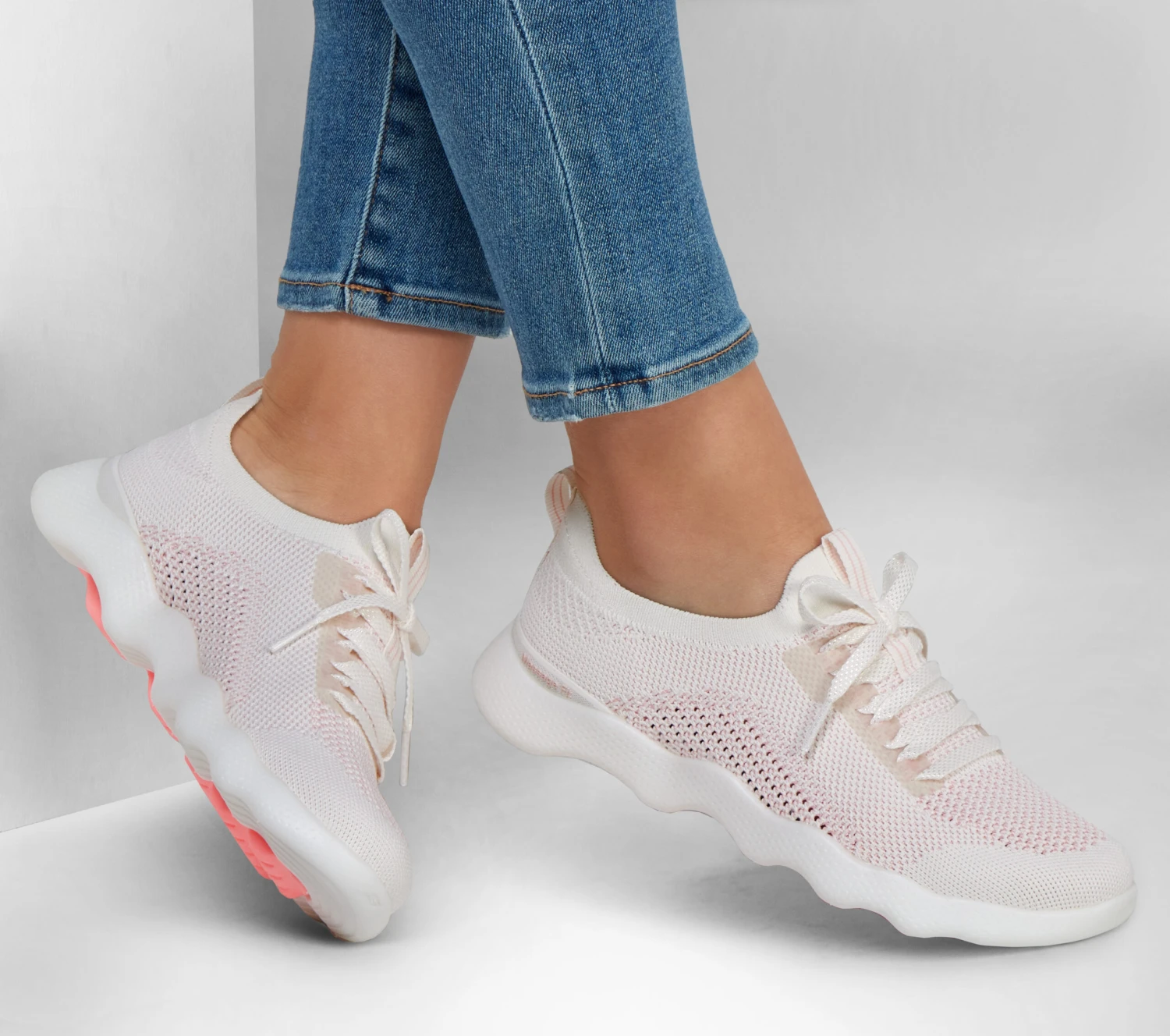 Enhance your daily walks with waves of comfort wearing Skechers Massage Fit Lite – Entice. This innovative design features a two toned Stretch Fit® mesh upper with deco laces, lightweight HYPER BURST® cushioning, and a gently massaging midsole.