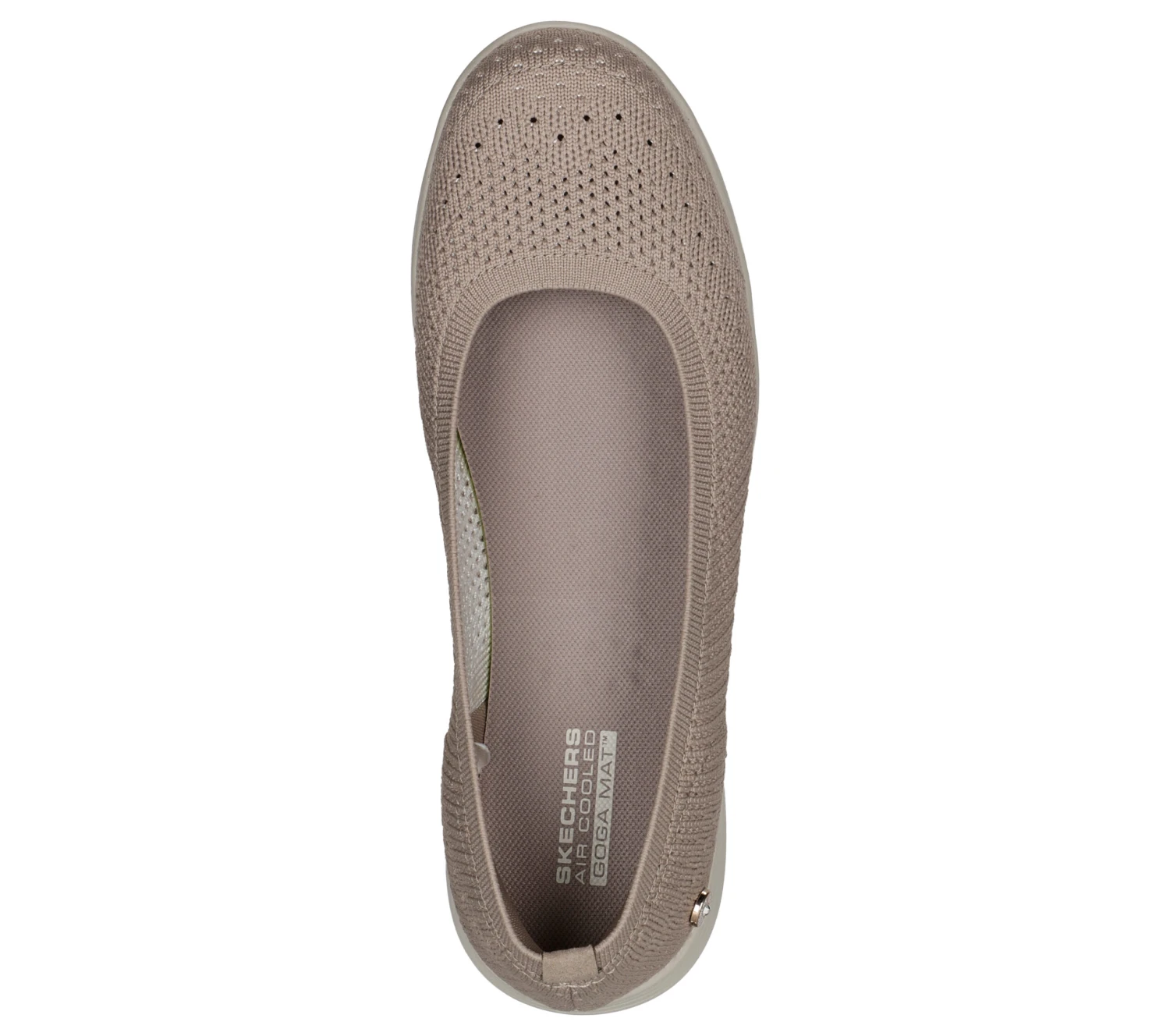 Slip on effortless style with easy-wearing comfort in Skechers On-the-GO® Dreamy – City Chic. This casual Stretch Fit® skimmer flat features a breathable engineered knit upper, a Skechers Air-Cooled Goga Mat™ insole and a lightweight ULTRA GO® cushioned midsole.