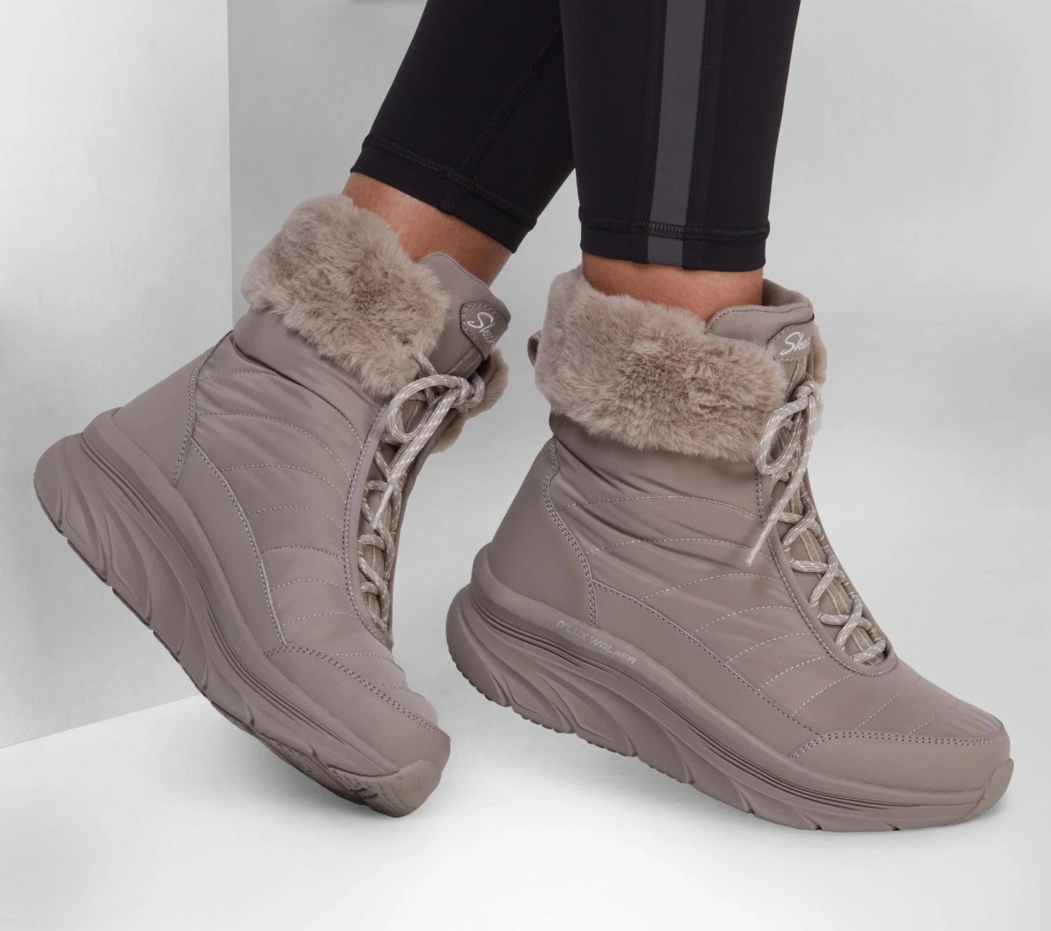 Enjoy cozier walks in supportive comfort wearing Skechers Relaxed Fit®: D’Lux Walker – Winter Solstice. This water-repellent cold-weather bootie features a lace-up woven fabric and synthetic upper, faux-fur lining and a cushioned Skechers Air-Cooled Memory Foam® insole.