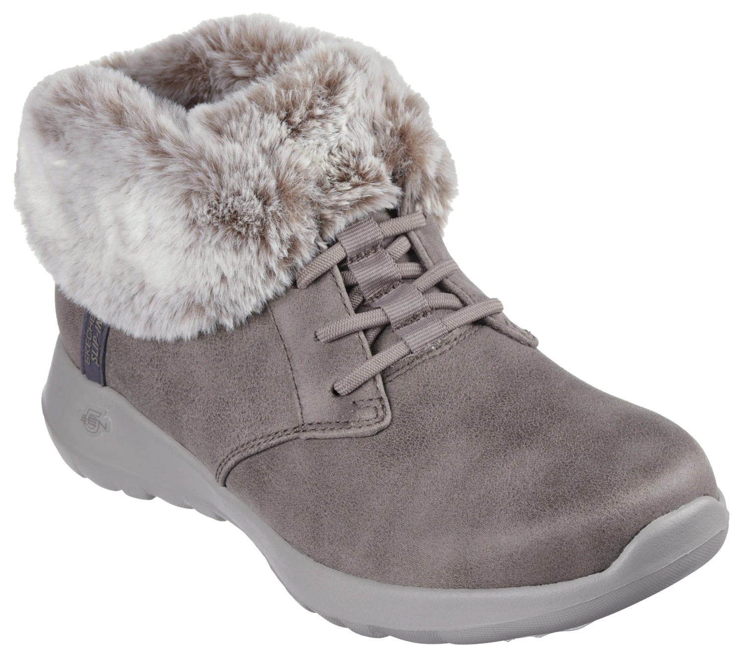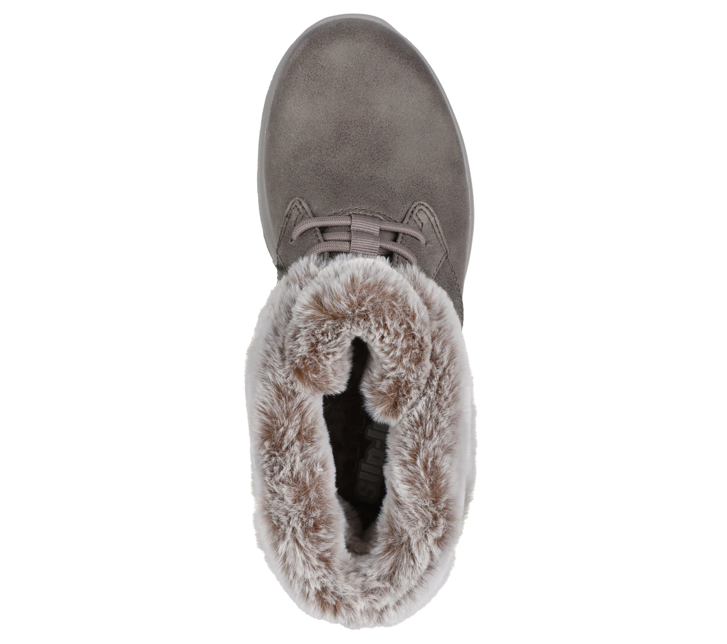 Enjoy the season in plush comfort with Skechers Hands Free Slip-ins®: On-the-GO® Joy – Cozy Charm. Designed with our exclusive Heel Pillow™, this bootie features a 3M® Scotchgard® treated vegan leather upper with stretch laces, faux-fur trim, 5-GEN® Technology cushioning, and a Skechers Air-Cooled Memory Foam® insole.