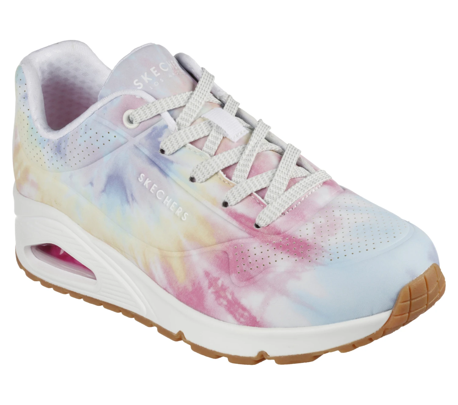 Cheerful colors brighten the mood wearing the Skechers Street™ Uno ` Hyped Hippie shoe. This lace-up sneaker features a synthetic durabuck with an allover tie-dye print, Air-Cooled Memory Foam insole and a platform wedge with visible Skech-Air air-cushioned midsole.