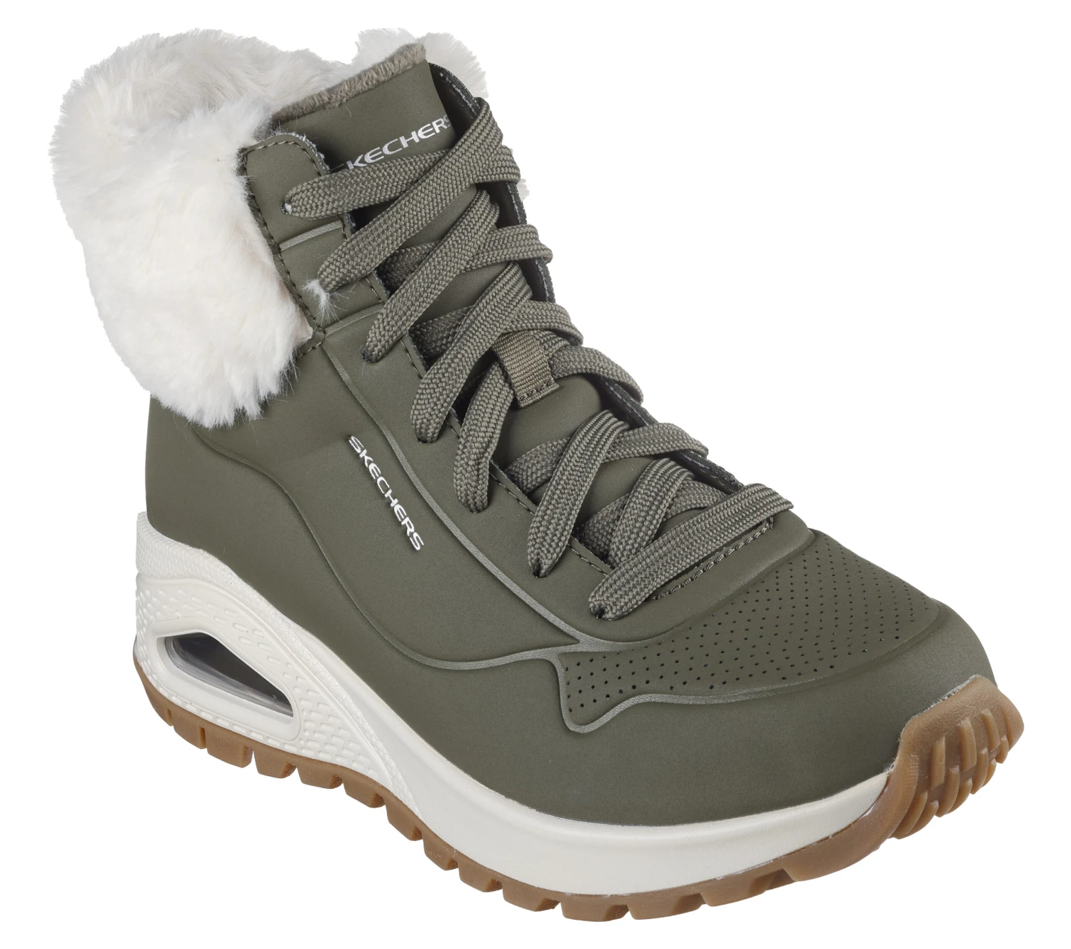 Step into stylish hiker vibes with Skechers Street Street Uno Rugged – Fall Air. This lace-up fashion sneaker boot features a perforated synthetic upper with faux-fur trim, a Skechers Air-Cooled Memory Foam® and a Skech-Air® visible airbag midsole.