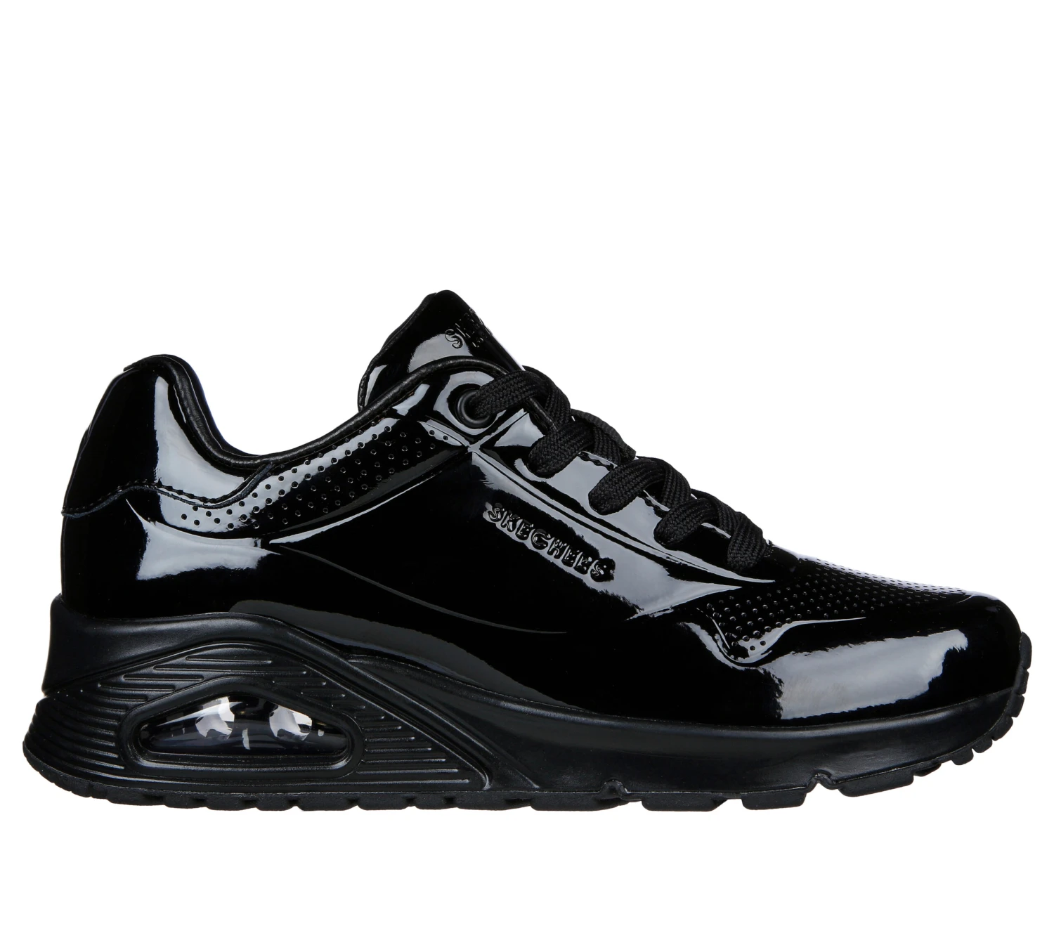 Sleek and eye-catching style arrives in Skechers Street Uno – Shiny One. This lace-up features a patent leather upper, Skechers Air-Cooled Memory Foam® insole and a visible Skech-Air® airbag midsole.