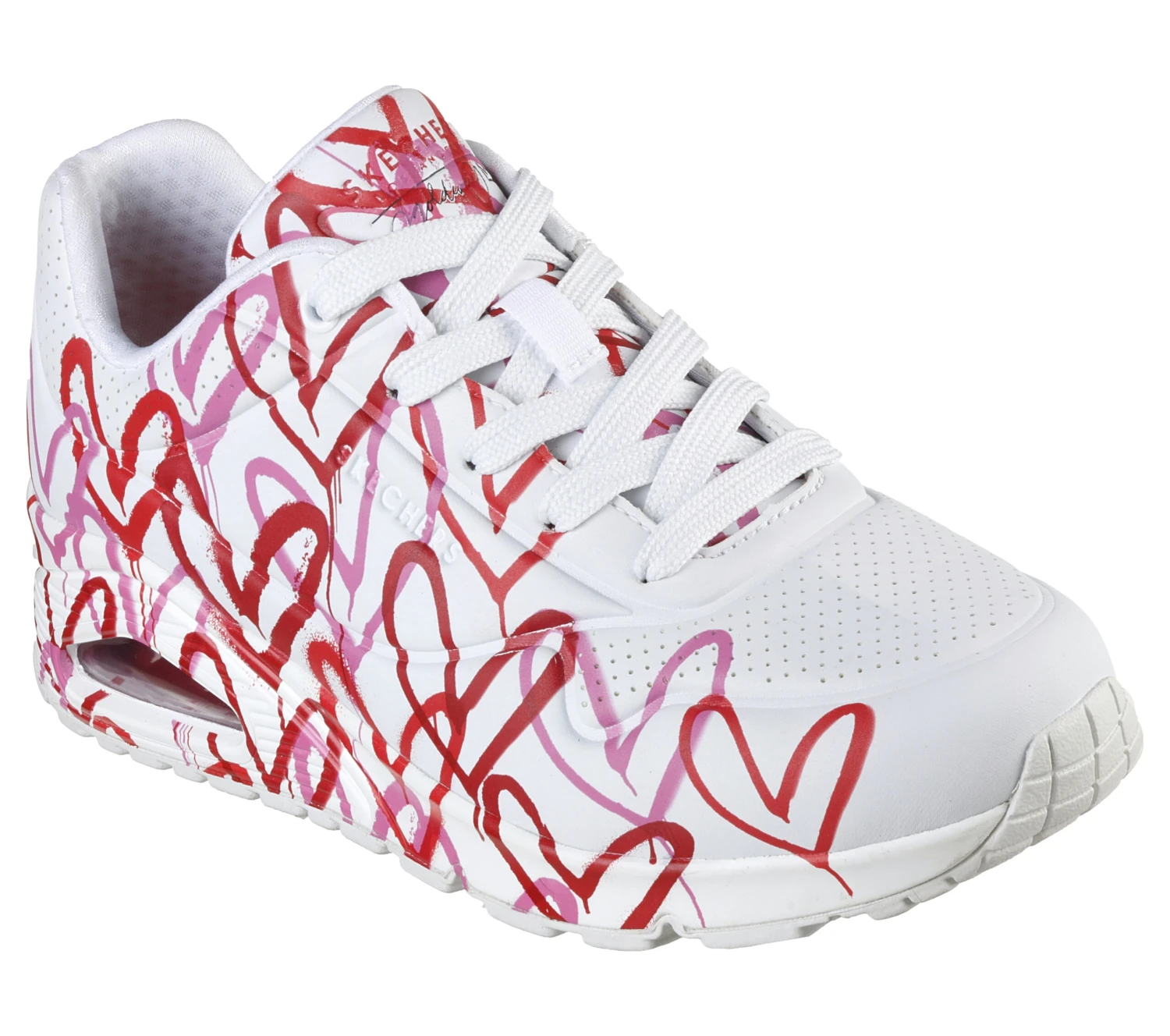 Internationally renowned muralist James Goldcrown brings his iconic #Lovewall heart designs to Skechers in this inspiring collaboration. Show your creative style with the Skechers x JGoldcrown: Skechers Street™ Uno – Spread the Love. This lace-up fashion sneaker features an allover print of the artist’s signature heart design that extends to the outsole, synthetic durabuck and perforated trimmed upper with a Skechers Air-Cooled Memory Foam® insole, and a platform wedge with visible Skech-Air® air-cushioned midsole.